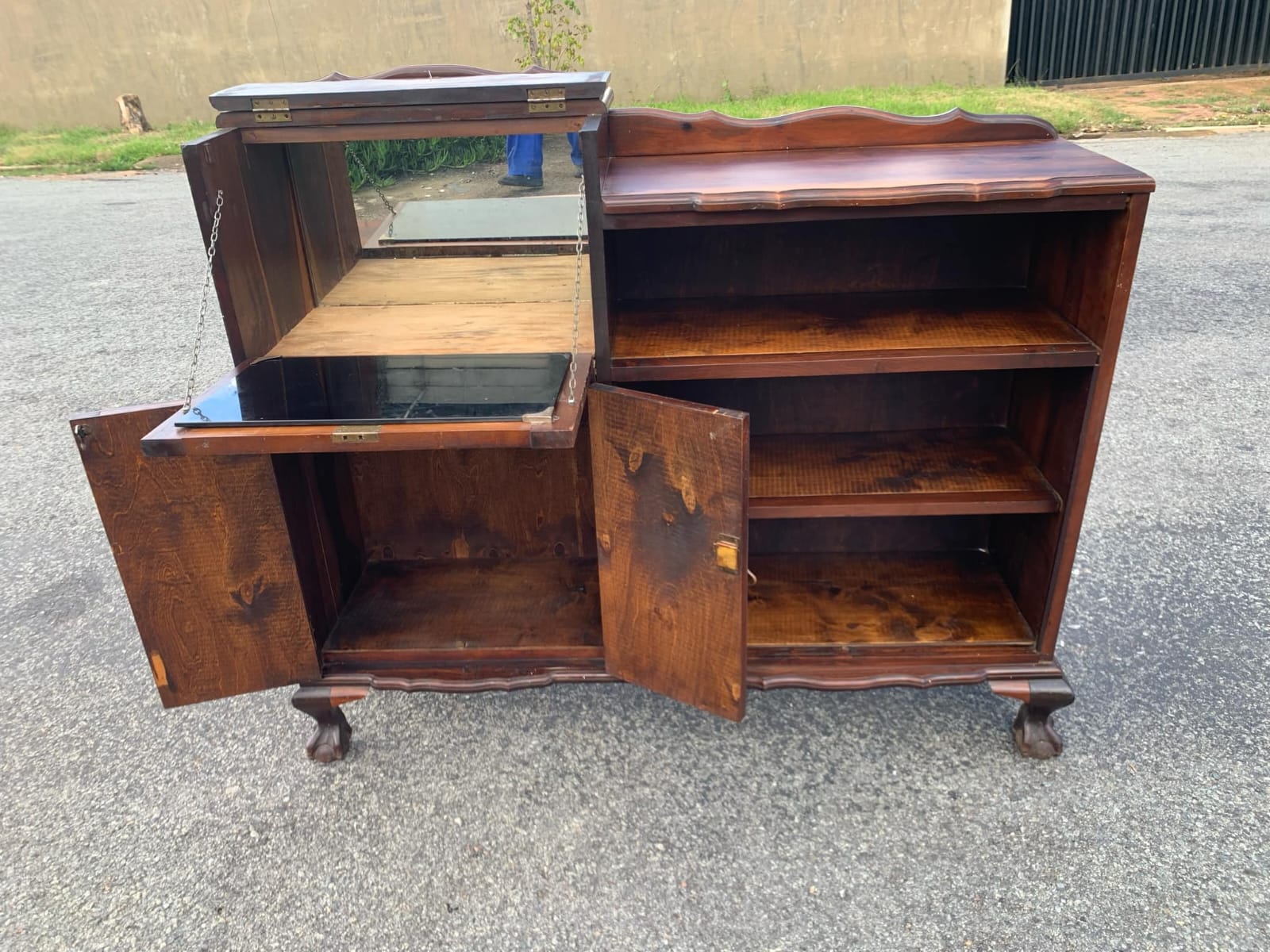 Vintage Imbuia Ball & Claw Cabinet – 3 doors/3 shelves (length 123.5 cm, width 32.5 cm, height 104.5 cm)