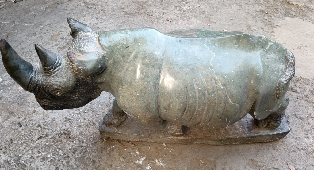 Stone Sculpture of a Rhino – possibly serpentine or soapstone (grey stone) (length 73 cm, height 46 cm)