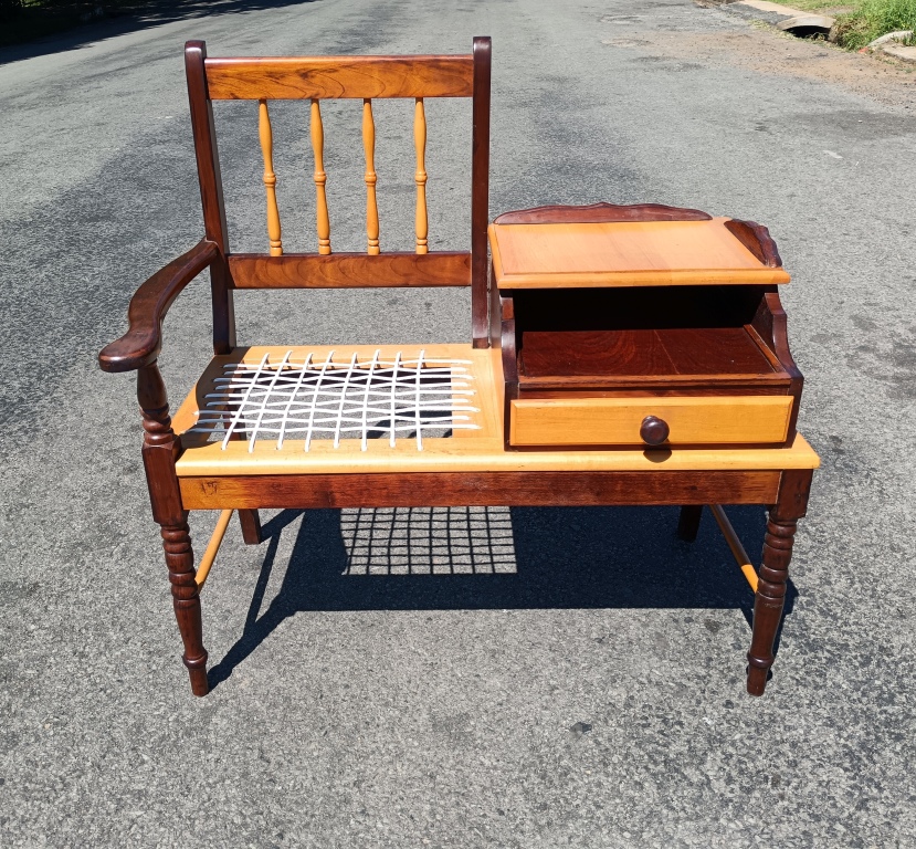 Palmarfin & Imbuia Telephone Table (length 96,5 cm, width 45,5 cm, height to seat 45,5 cm) new riempies